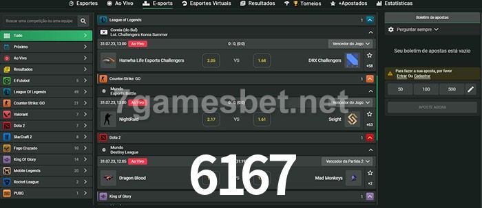 O 6167 oferece uma grande seleção de opções de apostas em e-sports com probabilidades competitivas